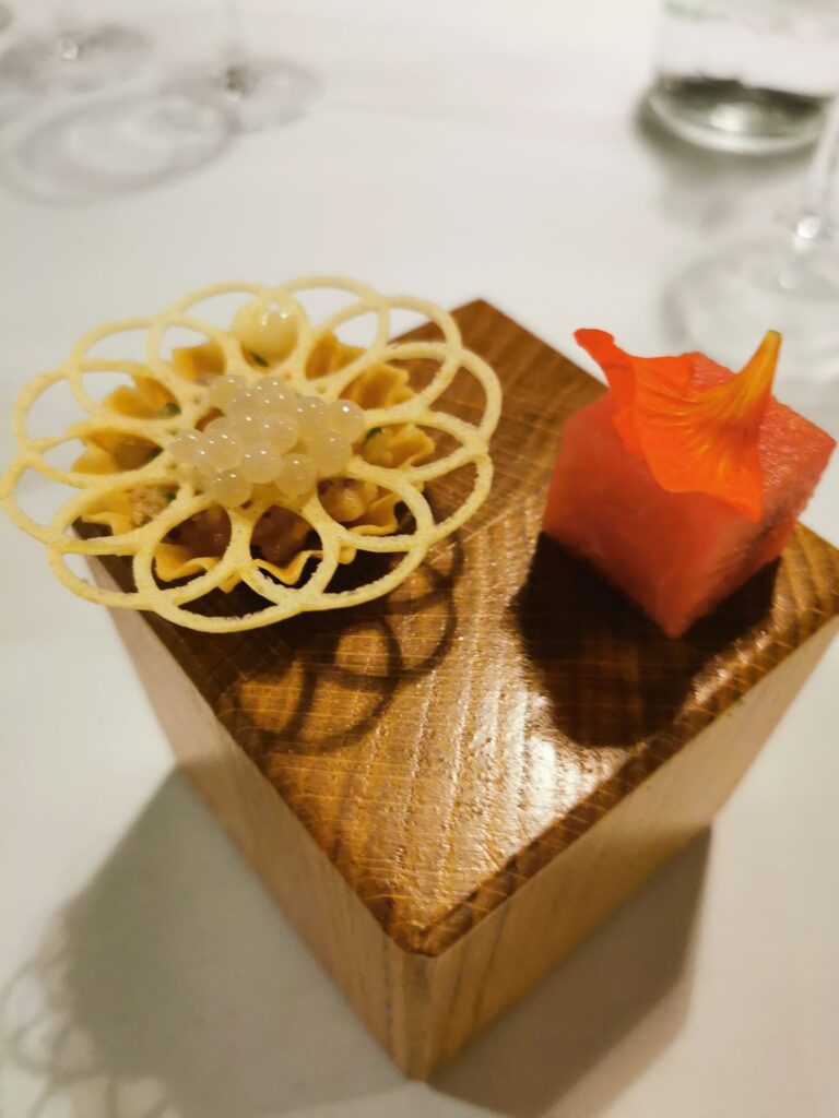 - Amuse-bouche – Łosoś MOWI Supreme wędzony, wasabi, ziemniak, por, kawior ze ślimaka – Łukasz Cichy