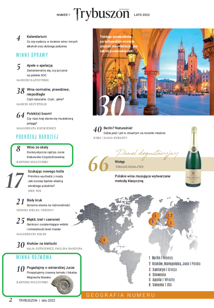 Zapraszamy również na łamy nowego kwartalnika winiarskiego TRYBUSZON – Bartosz Promotor Kulinarny członek zespołu Radia Kulinarnego przygotował artykuł – przewodnik enoturystyczny po Jurze Krakowsko-Częstochowskiej pt. „WINO ZE SKAŁY” z poleceniami miejsc winiarskich i kulinarnych. Bartosz przepytał również w artykule Wojtka Bosaka o specyfikę winiarską tego regionu i win tu powstających. Szukajcie TRYBUSZONA w Empikach i miejscach winiarskich.