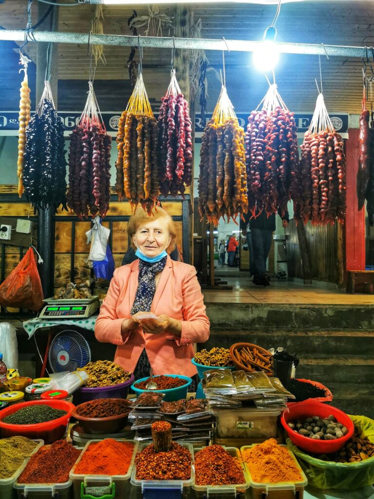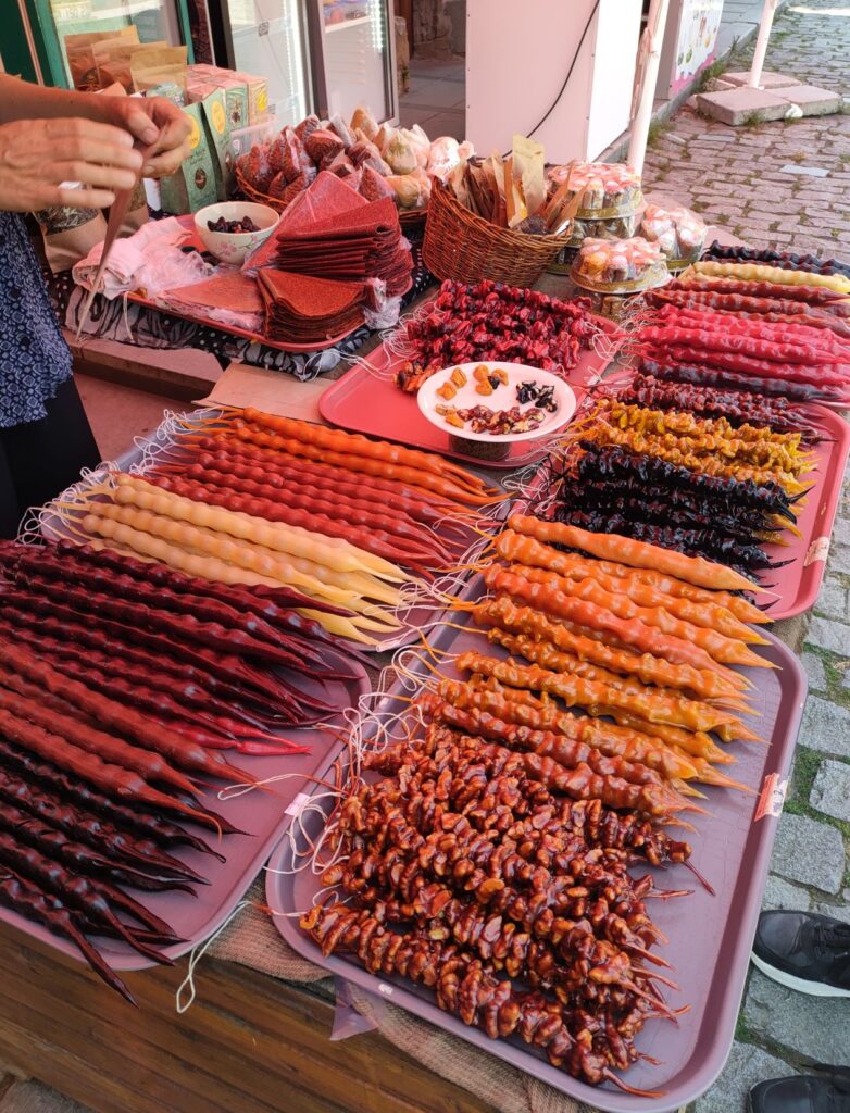 Czurczchela – po gruzińsku ჩურჩხელა / churchkhela – to smakołyk zrobiony z prostych składników – zagęszczonego soku winogronowego (wszak to kraj winiarski), orzechów i mąki. Można je kupić dosłownie na każdym kroku – począwszy od lokalnych targowisk, przez uliczne stragany, na eleganckim sklepiku na lotnisku kończąc.