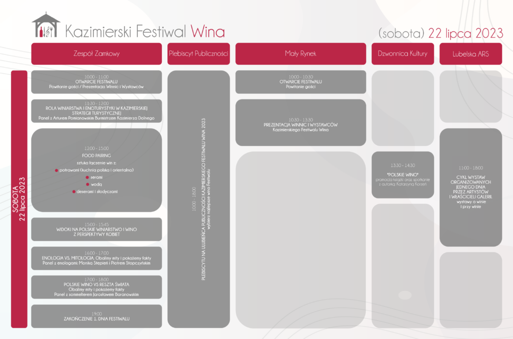 Kazimierz Dolny 21-23 lipca 2023 . Pierwsza edycja. STARTUJEMY! Uczta dla ciała i duszy! Winnice z całej Polski, fantastyczna kuchnia, serowarzy oraz artyści! Do tego spotkania i warsztaty z cenionymi w naszymi kraju enologami i sommelierami! Festiwal z bogatą ofertą winnic, kulinariów, spotkań autorskich oraz warsztatów!